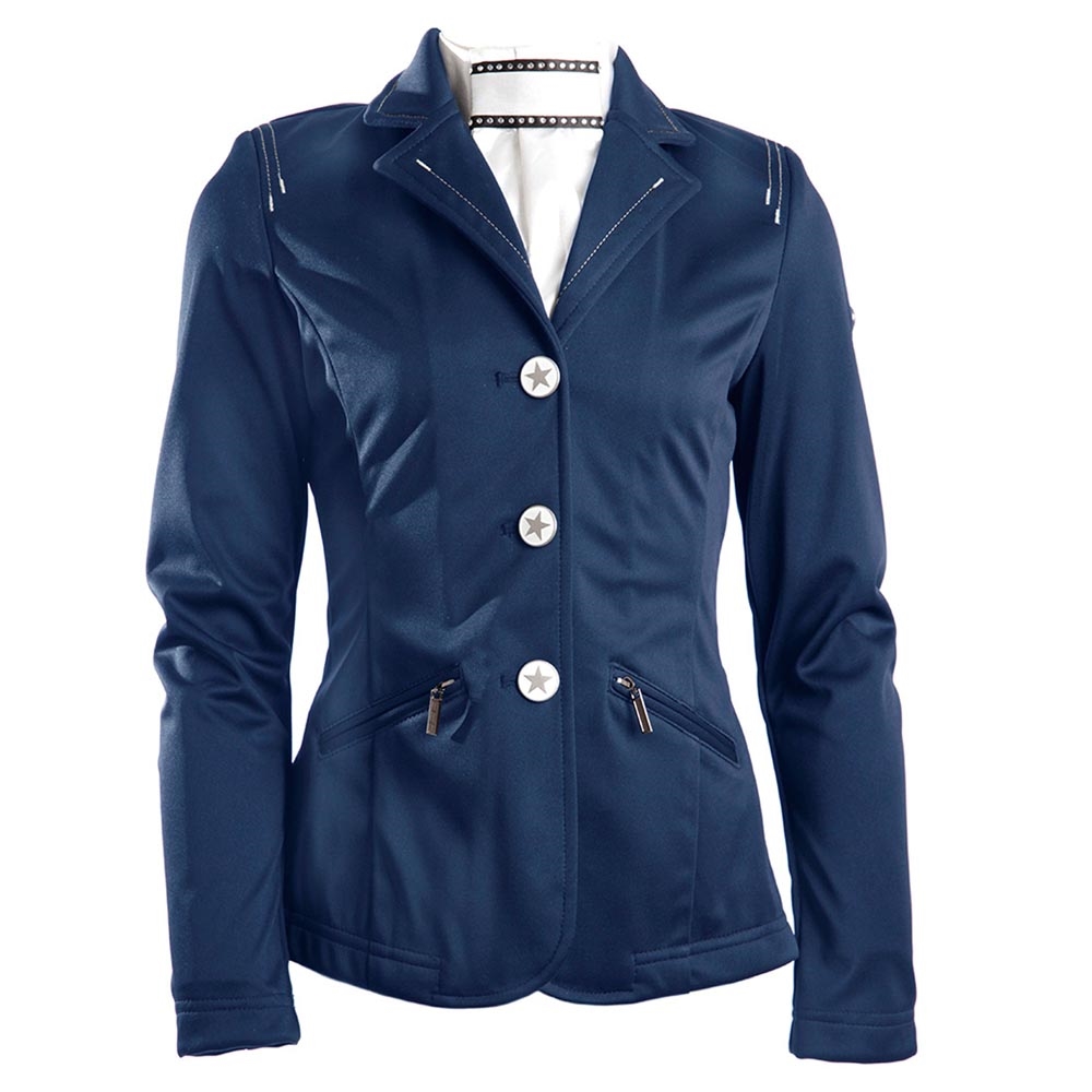 Stilfuld stævnejakke med to rideslidser bagpå. stævnejakken er i meget konfortabel strækmateriale og har kontrastsyninger på skulder, krave og revers.
