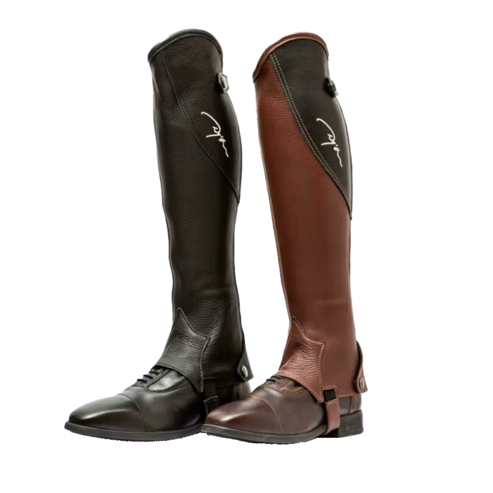 Dyon Original Leggins er fremstillet i smidigt fuldgarvet læder (2 mm), som sikrer både komfort og holdbarhed. Legginsen har nylon YKK-lynlås og elastik bag læggen for perfekt pasform. Det unikke design inkluderer elastisk rem under knæhasen og læderrem på elastikken under skoene, som holder legginsen på plads under ridning. Den originale halv-chaps-top i dråbeform er dekoreret med Dyon-logobroderi i cremefarvede syninger for et elegant finish.