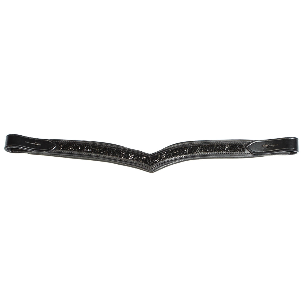 Dette elegante V-formede pandebånd er udsmykket med smukke sorte moon rock sten, som giver et stilfuldt og eksklusivt udtryk. Pandebåndet er fremstillet i blødt kvalitetslæder og har et diskret spænde i hver side, hvilket gør det både holdbart og nemt at arbejde med.
