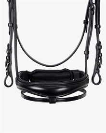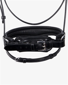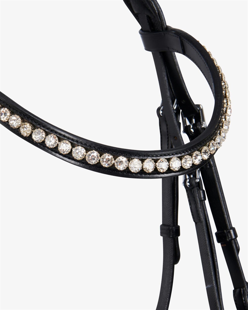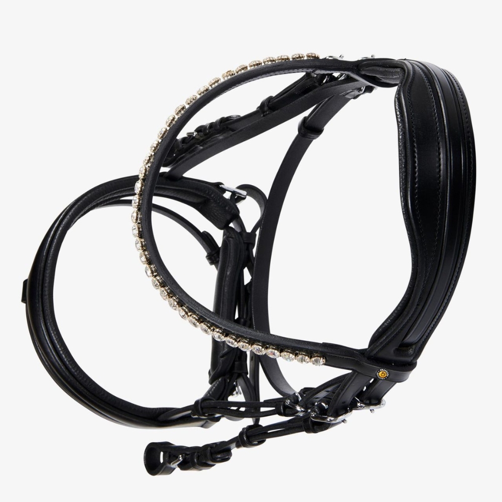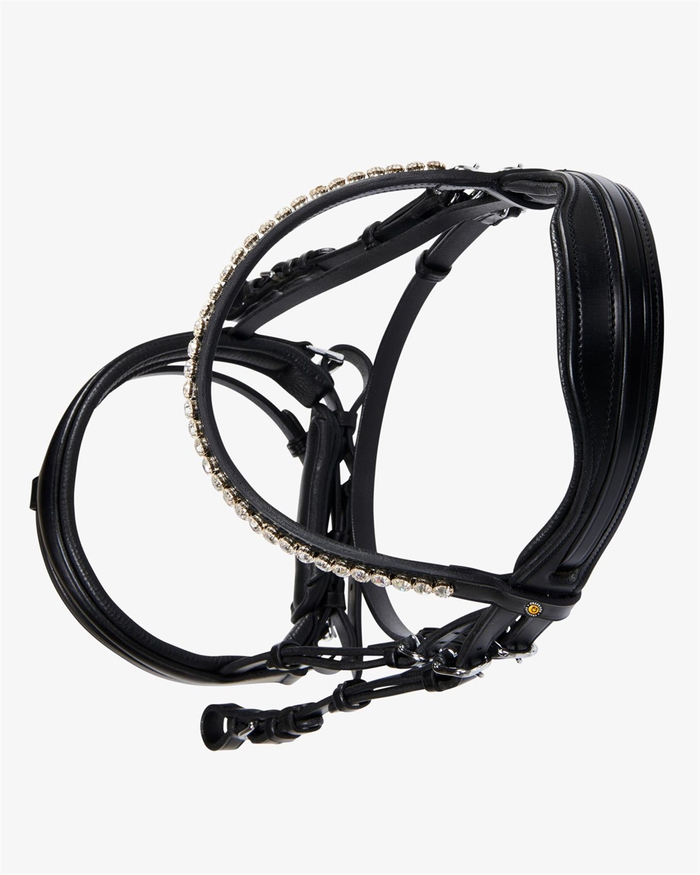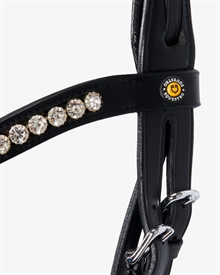 Næseremmen har pull-back lukning, og både næserem og hagestrop er justerbare for perfekt pasform. Pandebåndet er polstret og dekoreret med indlejret glitter sten samt en elegant Equestro logo-plade i metal, som giver et eksklusivt finish.