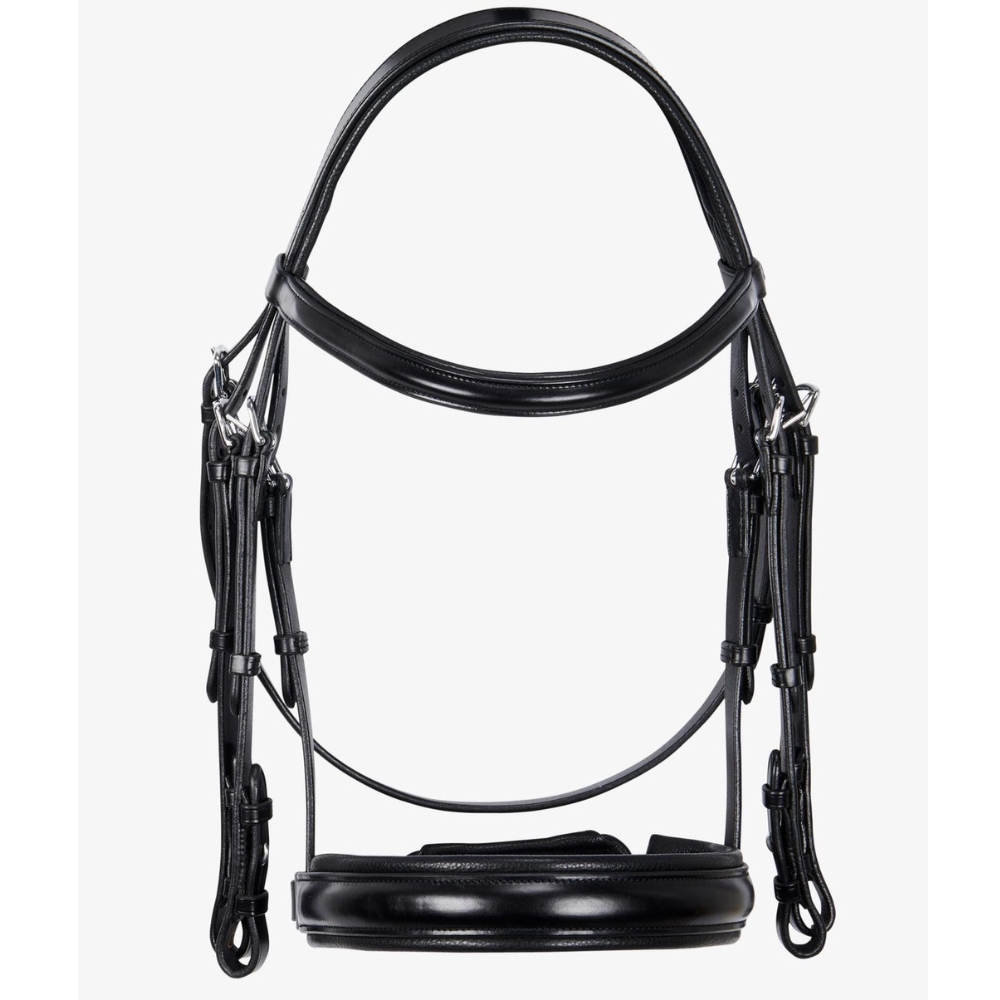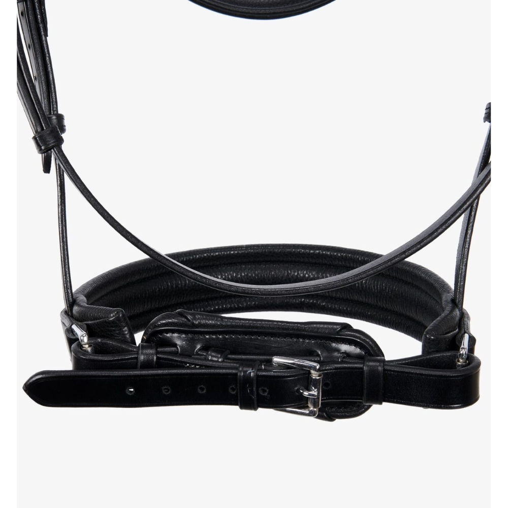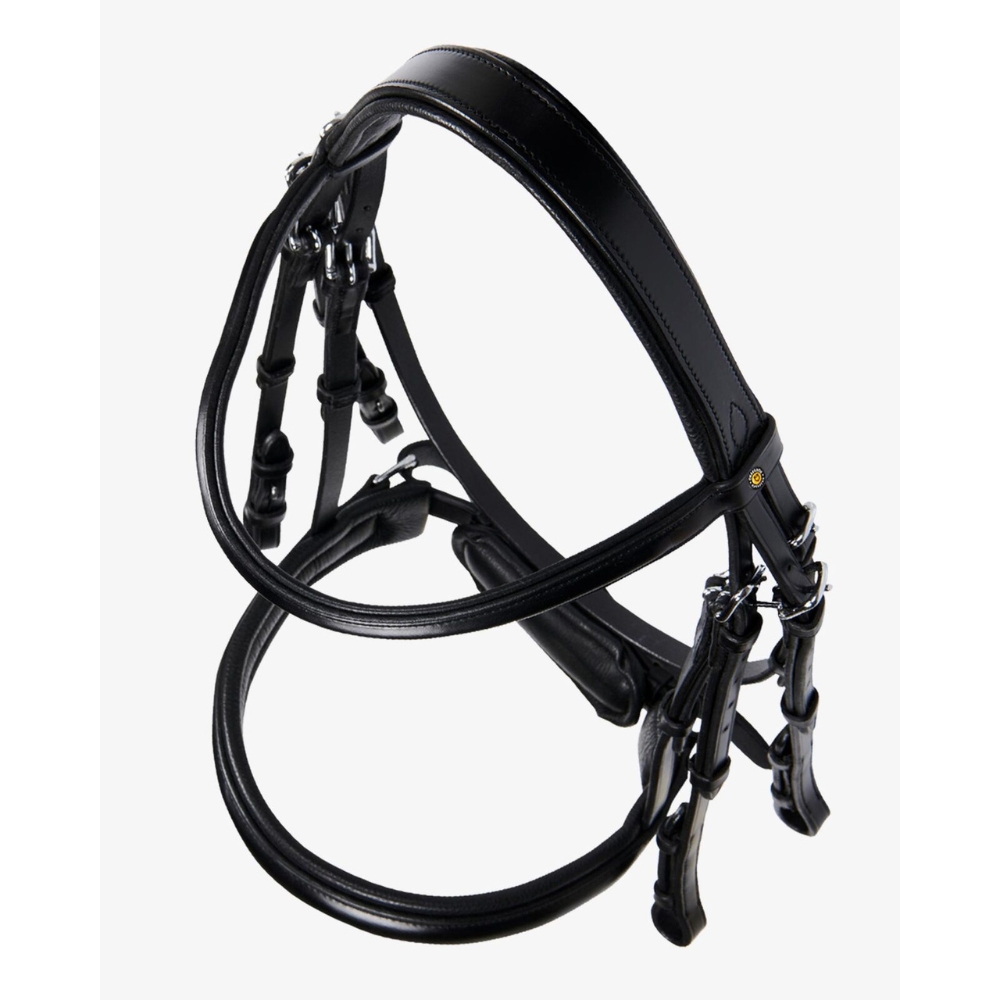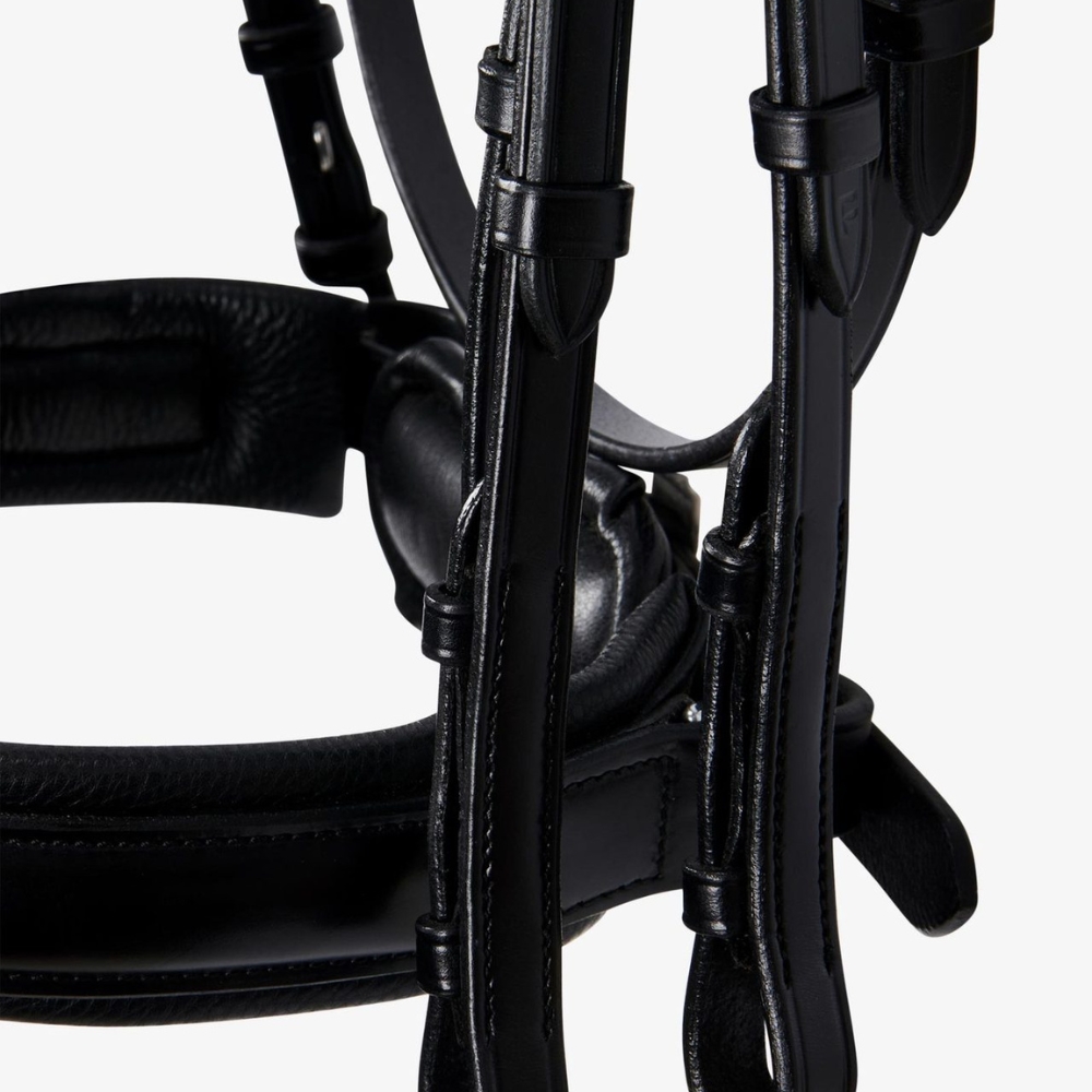 Den anatomisk formede nakkerem er designet til at fordele trykket jævnt over et større område i nakkens mest følsomme zone, hvilket øger hestens komfort. Næsebåndet er udstyret med en pull-back lukning, monteret på en polstret og aftagelig beskyttelsesflap, som sikrer nem og skånsom tilpasning.
