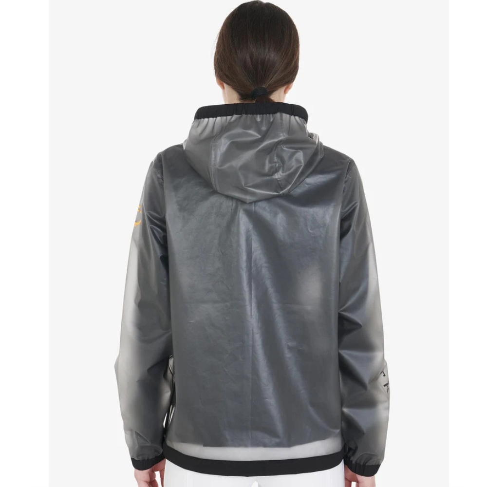 Regnfrakken er fremstillet i et transparent, vandtæt materiale, der giver et stilrent og minimalistisk look, samtidig med at den beskytter effektivt mod regn og vind.