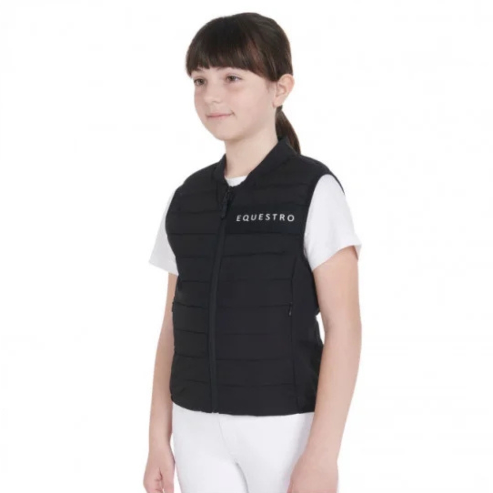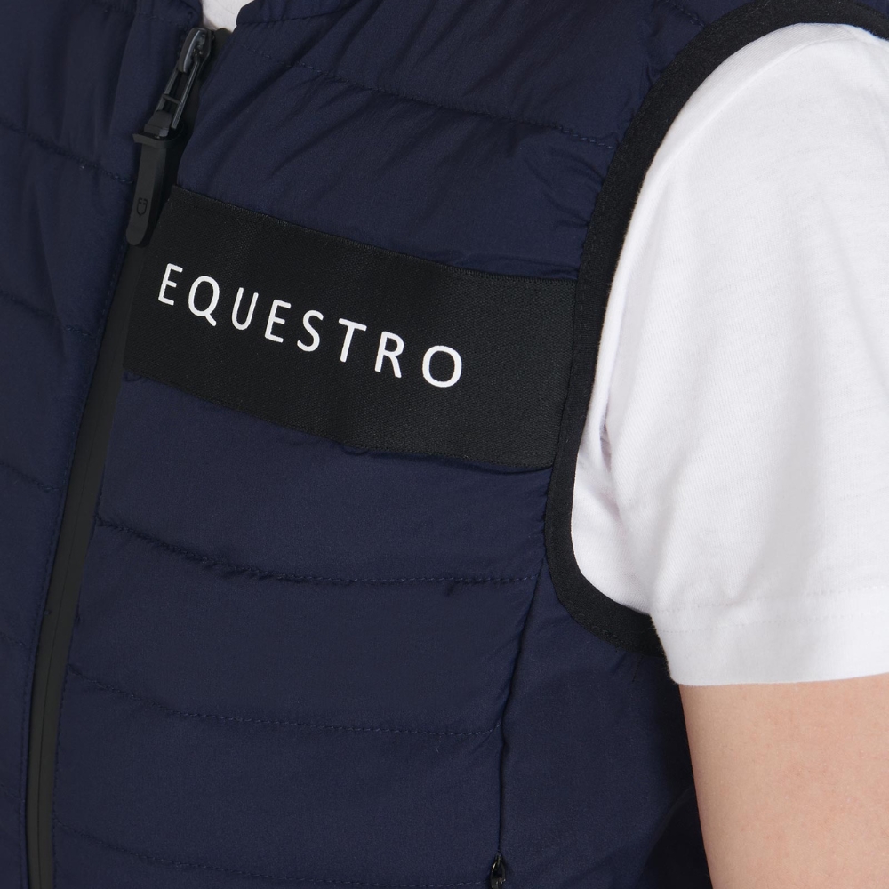 Equestro børnevesten er lavet i et teknisk, åndbart materiale, der hjælper med at regulere kropstemperaturen takket være det mikroperforerede stof. Den er let polstret, så den giver behagelig varme på kølige dage, samtidig med at åndbarheden bevares for effektiv svedtransport.
