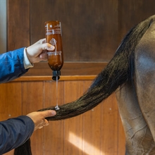 Gør hestens pels våd. Tilsæt en lille mængde shampoo i en spand med lunkent vand eller påfør direkte på den våde pels og massér ind til skum. Ved genstridige pletter kan shampooen bruges ufortyndet. Skyl grundigt med lunkent vand og skrab forsigtigt overskydende vand af hesten.