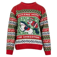 Selv julemanden har droppet slæden og taget turen hjem til jul på sin hvide hest, mens der står “Riding home for Christmas” på brystet – et sjovt og iøjnefaldende design, der med garanti får smilene frem.