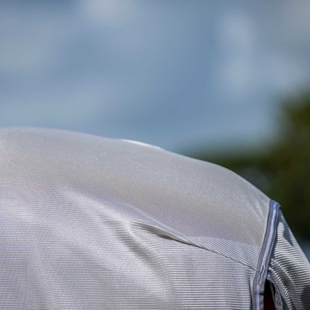Dækkenet er fremstillet i let og tætvævet mesh, som sikrer god ventilation, samtidig med at det yder 65% UV-beskyttelse. Den aftagelige hals er designet til store heste og giver fuld beskyttelse af hals og manke.