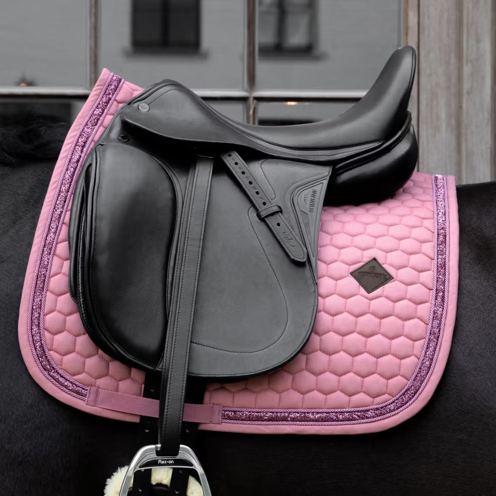 Skil dig ud og løft dit udtryk med Kentucky Glitter Band Dressur underlag – et eksklusivt sadelunderlag, der kombinerer raffineret design, høj komfort og funktionalitet. Det iøjnefaldende glitterbånd giver et elegant look, som fanger blikket, uanset om du rider til træning eller konkurrence.
