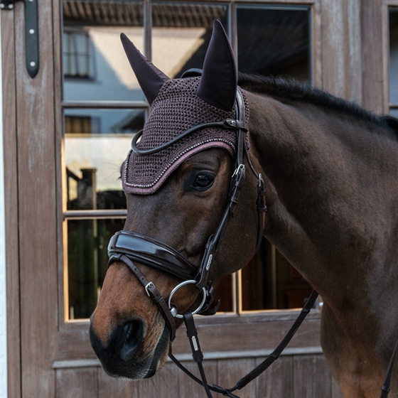 Lækker strikket hut med soundles, samt en enkel række med rhinsten og glitterbånd.
