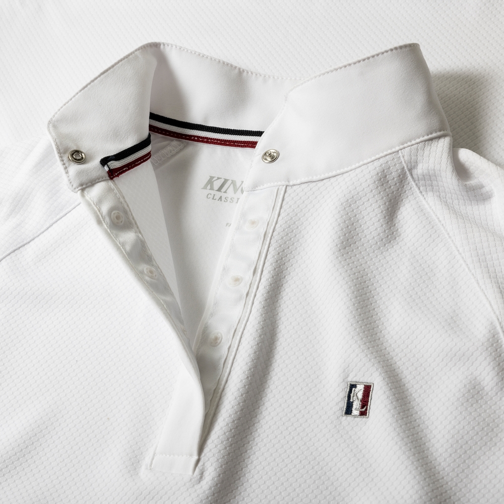 Sidepanelerne er lavet i mikro piqué-stof, som forbedrer ventilationen og hjælper med at holde kroppen kølig, selv når du rider med stævnejakke. Den klassiske silhuet og den stående krave med skjulte trykknapper giver et stilrent og traditionelt rytterlook, som gør denne bluse til en favorit blandt mange ryttere.