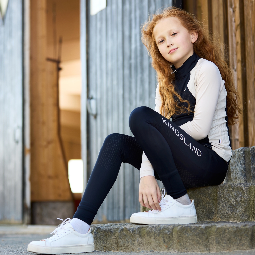 Kingsland KLLilo Junior Full Grip Tights F-Tec 5 er udviklet til unge ryttere, der ønsker maksimal bevægelsesfrihed, komfort og funktionalitet – både til daglig træning og lange dage i stalden.