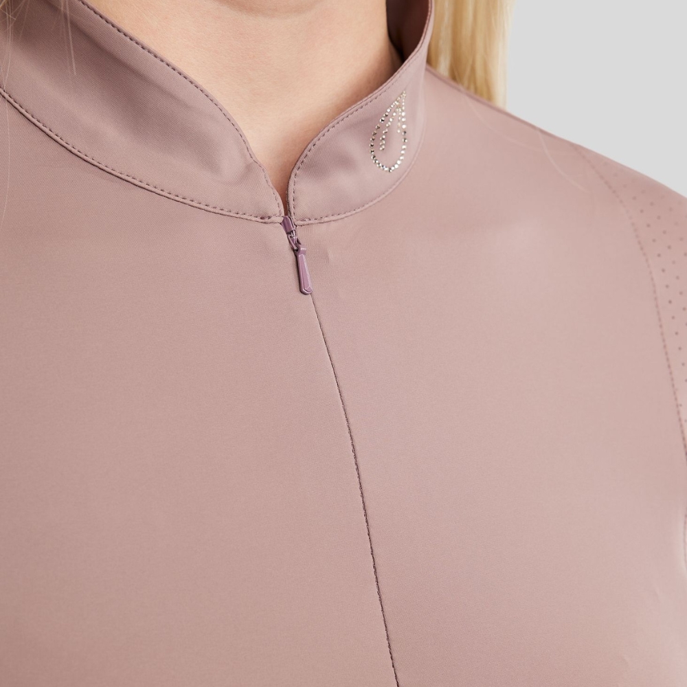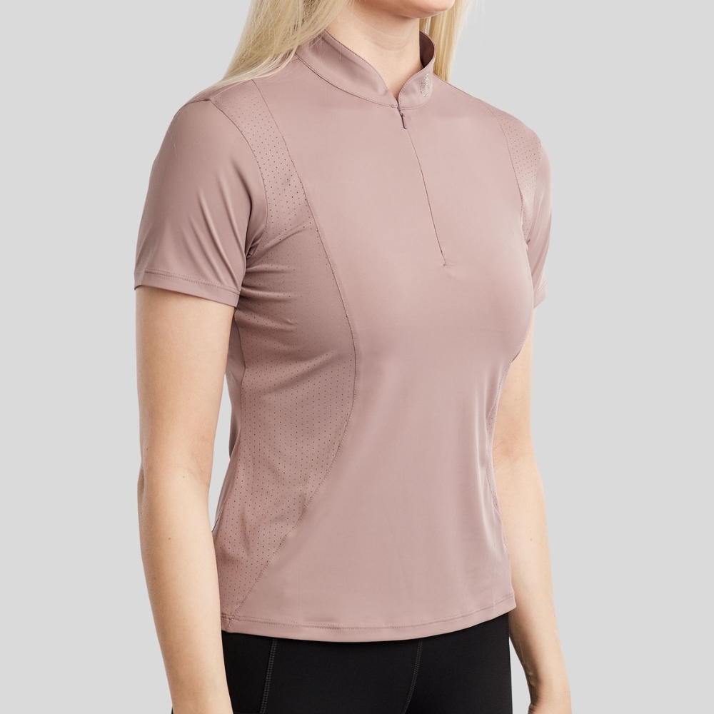 Poloen har et elegant og tidløst look med et smukt champagnefarvet krystallogo i kraven, som giver et feminint og luksuriøst udtryk. De flotte lasercut-detaljer langs siderne tilfører et moderne touch og sikrer samtidig god ventilation.