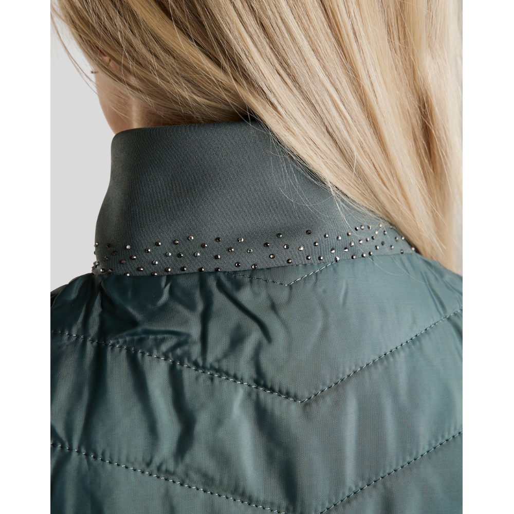 Bodywarmeren er designet med flatterende quiltede paneler på front og ryg, som tilføjer både varme og struktur. Sidepanelerne er fremstillet i blød og fleksibel softshell, der giver optimal komfort og bevægelsesfrihed – perfekt når du er aktiv i sadlen eller på farten. Kraven er udsmykket med et elegant mix af gråtonede krystaller, og på den ene skulder står “Montar” skrevet med samme type glitrende krystaller for et iøjnefaldende, feminint udtryk.