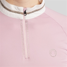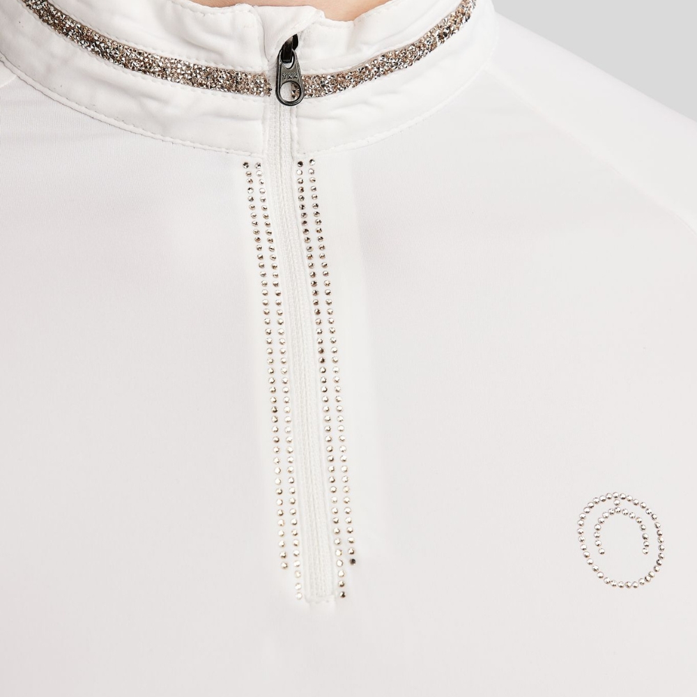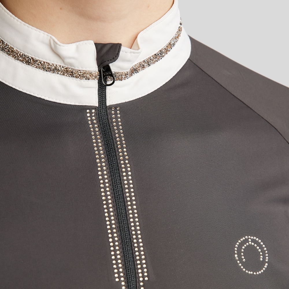 Blusen er fremstillet i et teknisk og elastisk materiale, der følger kroppens bevægelser og sikrer optimal komfort, uanset om du rider, varmer op eller står klar til start.