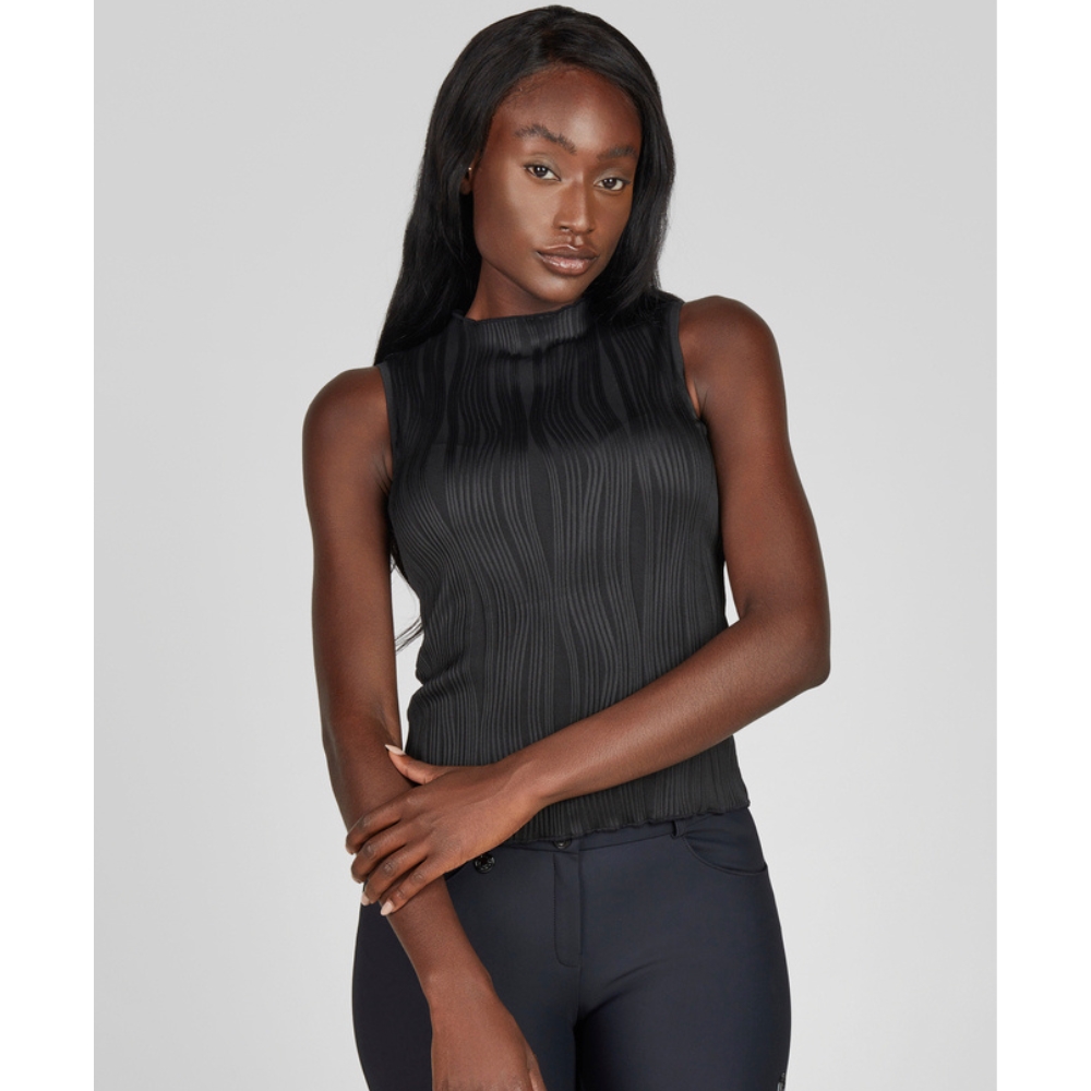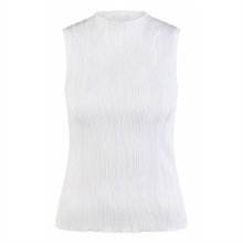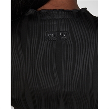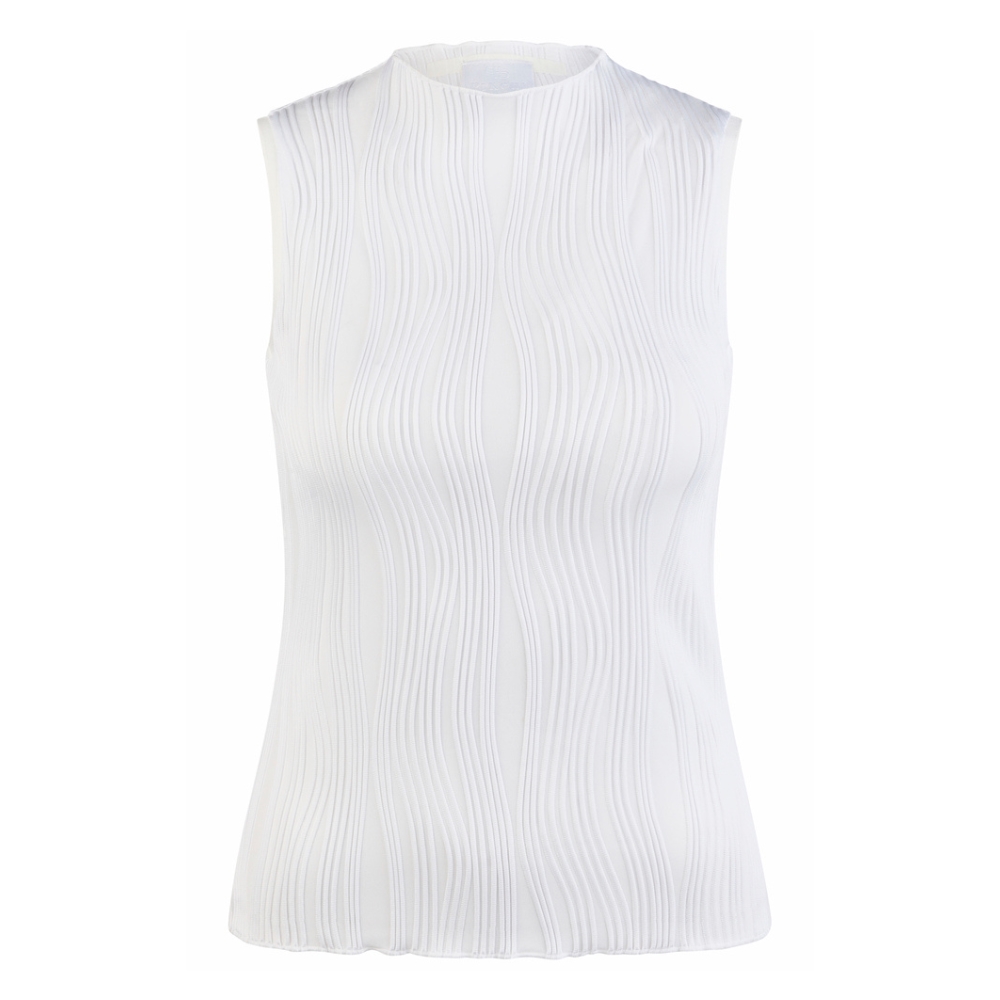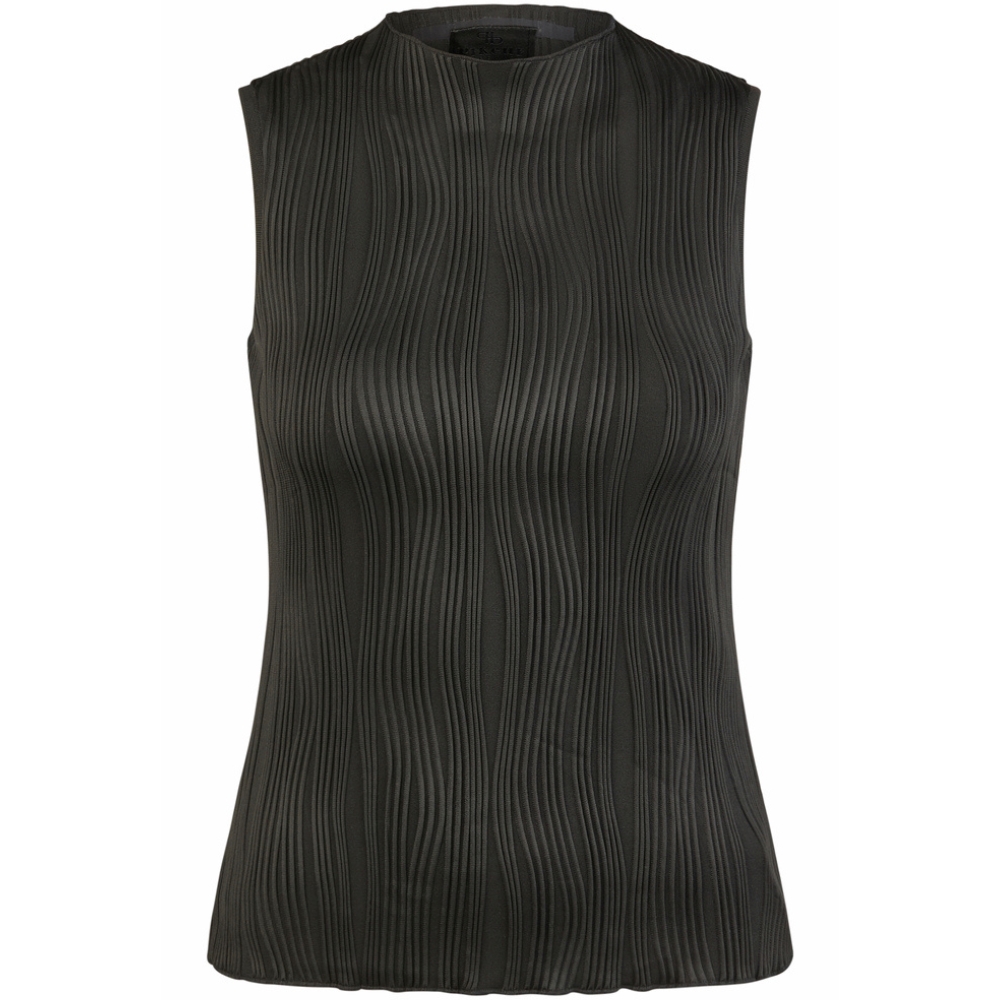 Toppen har en lille, stilren ståkrave, der giver et sofistikeret look. Den særlige krøllede (crinkle) materialestruktur tilfører et eksklusivt og moderne touch samt en let og behagelig fornemmelse mod huden.