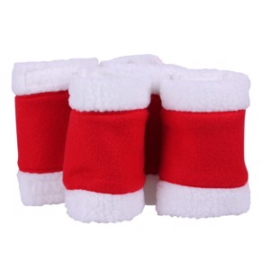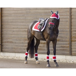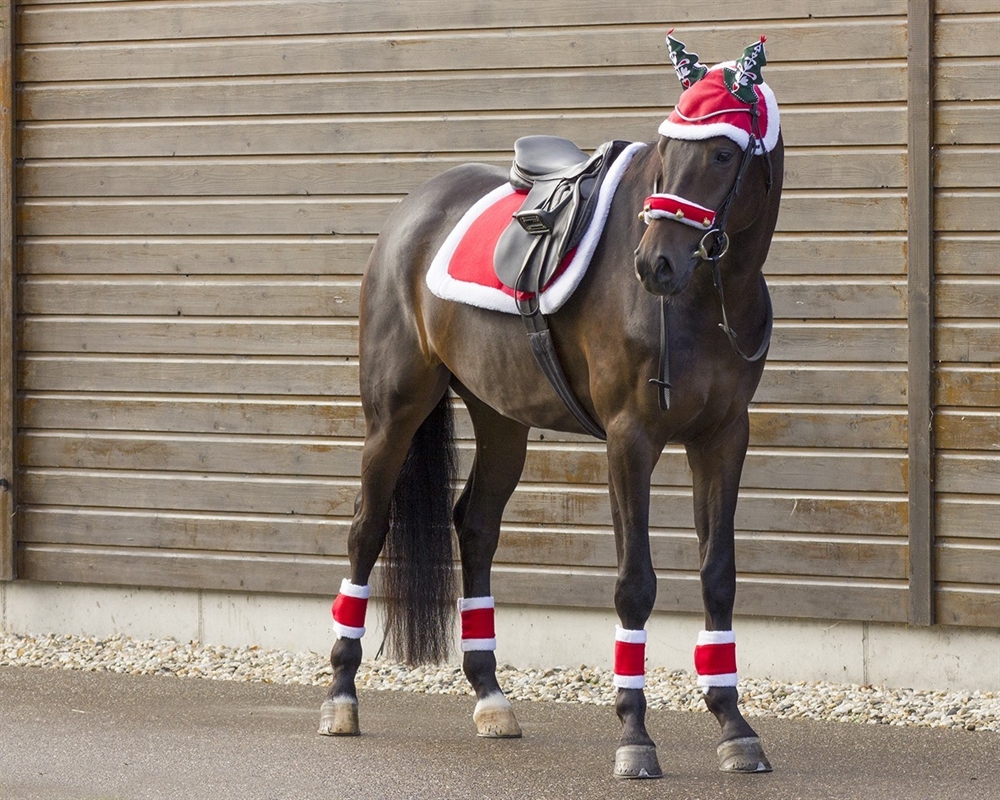 Gør din hest klar til jul med disse festlige julebandager i sæt af 4. Bandagerne er lavet i blød fleece og har både kant og foring i plys for et ekstra hyggeligt look. De lukkes nemt med velcro og er perfekte til juleridning, opvisninger eller fotosessions.