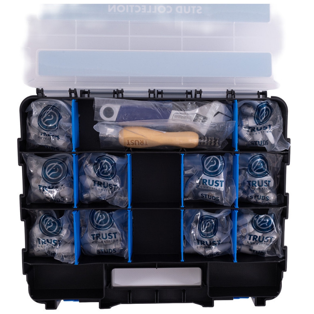 TRUST Stud Box Collection giver rytteren et komplet og professionelt sæt studs, så du altid er klar til træning og konkurrence – uanset underlaget. Precision, performance og pålidelighed samlet i én boks.