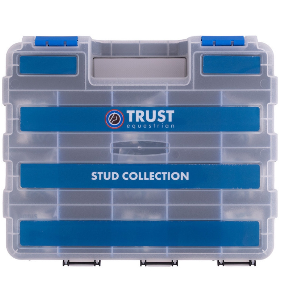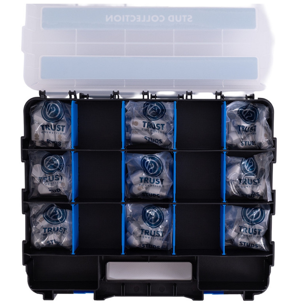 TRUST Stud Box Collection er det ultimative sæt til den erfarne spring- eller militaryrytter. Med 99 højkvalitets studs i forskellige former og størrelser er du klar til alle typer underlag – fra tørt græs til dybt og vådt terræn.